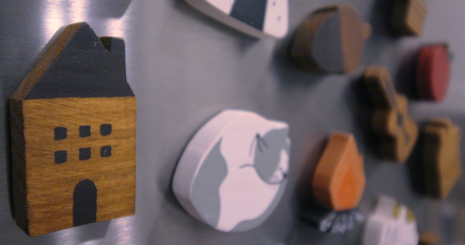 Japanese wooden magnets that come in different shapes and colors.
